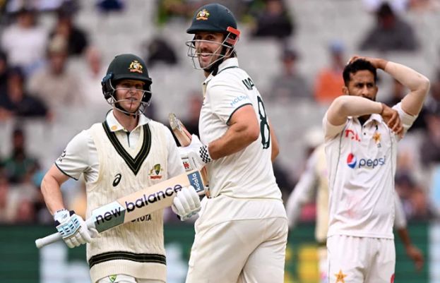 Pakistan were on top in the second Test against Australia in Melbourne after claiming four quick wickets in the second innings but Mitchell Marsh and Steve Smith helped the home side get back in the game with a crucial partnership. After the initial setbacks, Australia recovered to reach 187-6 at stumps with a lead of 241 runs. Marsh and Smith’s 153-run partnership brought Australia back in the game, after they were reduced to 16-4, on a pitch that was assisting the bowlers. Marsh, who was dropped on 20 by Abdullah Shafique, scored 96 runs in 130 balls with the help of 13 fours. Salman Ali Agha took a sensational catch at first slip as Marsh was dismissed by Mir Hamza. He dived low to his right and completed a one-handed catch to end Marsh’s game-changing knock. Meanwhile, Smith was dismissed on the final ball of the day by Shaheen Afridi after scoring 50 runs. Resuming at 6-2 after lunch, Mir Hamza took two wickets in as many balls to rattle the home side. David Warner (6) chopped one onto the stumps, meanwhile Travis Head (0) was bowled by a sharp inswinger. Earlier on day three, the visitors were dismissed for 264 in their first innings in reply to Australia’s 318. Cummins ended with 5-48, while Nathan Lyon grabbed 4-73 after Pakistan’s tail wagged in Melbourne to narrow the hosts’ first-innings lead to 54. It left the Australians with a tricky 15 minutes of the morning session to negotiate, which they failed to do miserably as they slumped to 6-2 at lunch. Khawaja was out for a duck second ball, caught behind by Mohammad Rizwan off Shaheen Shah Afridi. The same combination struck again on the last ball before lunch, when Labuschagne edged down the legside to be out for five, which left David Warner the not out batsman on one at the break. Pakistan had looked comfortable in reaching 124-1 as they chased Australia’s first-innings 318. But an electric spell from Cummins in the final session on Wednesday saw them collapse to 194-6, and he was at the heart of the action again on Thursday. After light drizzle delayed the start by 45 minutes, they resumed 124 runs adrift with Rizwan on 29 and Aamer Jamal not out two. Wicketkeeper Rizwan, picked ahead of Sarfaraz Ahmed for his batting prowess, made a confident start. But he was no match for a canny Cummins, who tempted him into a drive that flew straight to David Warner who had just been moved to cover from slip. Rizwan was gone for 42 to end a 45-run partnership with Jamal, who started to play shots with new partner Afridi as they chipped away at the lead. An enterprising Afridi crunched four boundaries before he was undone by Lyon’s spin, trapped lbw for 21. Jamal looked in good touch, finding the ropes three times in six balls at one point in his 33 not out. Cummins grabbed his fifth wicket to dismiss Hasan Ali for two with a delivery that took out his off stump. Lyon then had Mir Hamza stumped for two to collect his 505th Test wicket.