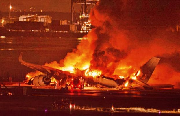 A Japan Airlines passenger jet appears to have collided with a coastguard aircraft while landing in Haneda airport in Tokyo, skidding down the runway in flames before all 379 passengers and crew were evacuated safely. The coastguard said five of the six members in its plane, which was carrying supplies as part of Japan’s earthquake relief efforts, were still unaccounted for. The pilot was evacuated. Live television footage showed a landing jet about to touch down at night before a bright orange flash, with the plane continuing to roll on the runway with flames and smoke trailing behind it. A large fire was burning on the tarmac where the explosion first occurred. Separate video showed firefighters tackling the blaze on the passenger jet, which was bent over on its nose, with flames coming out its windows. More than 70 fire engines fought the flames. The Airbus aircraft had departed from Shin-Chitose airport in Hokkaido. The Japanese prime minister, Fumio Kishida, had instructed relevant agencies to coordinate to assess the damage swiftly and provide information to the public, according to his office. Haneda, which was closed after the crash, is one of the busiest airports in Japan, and many people travel over the new year holidays.