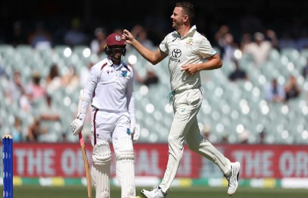 An inspired spell of bowling from Josh Hazlewood and a brilliant attacking century from Travis Head put Australia in complete control of the first Test against the West Indies on the second day at Adelaide Oval on Thursday. After Head smashed 119 from 134 balls to take Australia to 283 and a first-innings lead of 95, Hazlewood took four wickets for just two runs at the start of the West Indies second innings to deal a hammer blow to the visitors. At stumps on the second day, the West Indies were 73-6, still 22 runs from making Australia bat again. Joshua Da Silva was not out 17, with Justin Greaves dismissed off the last ball of the day’s play. Josh Hazlewood removed the top four West Indies batsmen in a superb spell of seam bowling. He dismissed Tagenarine Chanderpaul for a first ball duck, then in his next over he had captain Kraigg Brathwaite caught by Travis Head at a deepish short leg. The West Indies were 7-3 when Alick Athanaze gloved a bouncer to keeper Alex Carey, then 19-4 when Kavem Hodge edged to Steve Smith at second slip. Kirk McKenzie and Greaves tried to rebuild the innings and took the score to 40 before McKenzie tried an expansive drive off Cameron Green, only to spoon the ball to Marnus Labuschagne at short cover. Greaves and Da Silva batted sensibly and looked certain to take the West Indies safely to stumps, only for off-spinner Nathan Lyon to trap Greaves lbw for 24. On a pitch that troubled every other batsman, Head seemed to be playing on a different surface, bringing up his seventh Test century with a glorious cover drive to the boundary. He eventually fell after making a brisk century, caught brilliantly on the boundary by Kavem Hodge off the bowling of Alzarri Joseph, but by then the damage had been done and Australia were firmly in control. The Australians were expected to dominate a below-strength West Indies, who have three players on debut in this match. But led by exciting newcomer Shamar Joseph, the visitors took regular wickets throughout the first two sessions to initially keep the Australians on the back foot. Joseph, playing only his sixth first-class match, ended with 5-94 in a magnificent Test debut. Australia had reshuffled their batting order on the retirement of David Warner, moving Steve Smith to opener so they could bring Green back into the side. The first part of that experiment failed when Smith fell for 12 on Wednesday, so the Australians would have been hoping for big runs from the towering Green. But he was gone for 14 in just the second over on Thursday morning, caught by wicketkeeper Da Silva off Shamar Joseph to leave the Australians 67-3. All the batsmen struggled with the slow pace and variable bounce of the wicket but Head rode his luck, his typically counter-attacking century included 12 fours and three sixes and proved the difference between the two sides.