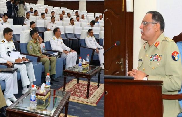 Chairman Joint Chiefs of Staff Committee General Sahir Shamshad Mirza, addressed the participants of 53rd PN Staff Course at Pakistan Navy War College, Lahore today. According to ISPR, the Chairman JCSC highlighted the efforts of the Pakistan Armed Forces in amicably confronting multifaceted traditional and non-traditional security challenges. The Chairman JCSC appreciated the role of Pakistan Navy as a combat ready force; that has always lived up to the expectations of nation to safeguard maritime interests of Pakistan. He underscored that Pakistan Navy has a proud history of valour and sacrifices for the motherland. Earlier upon arrival, the Chairman JCSC was received by Commandant Pakistan Navy War College Rear Admiral Azhar Mahmood. The CJCSC also laid wreath at the Yadgar-e-Shuhada and offered Fateha.