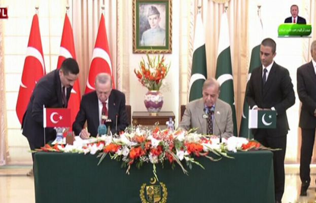 Turkish President Recep Tayyip Erdogan arrived at the Prime Minister House on Thursday morning, where he was warmly received by Prime Minister Shehbaz Sharif. The First Lady of Türkiye, Emin Erdogan, accompanied the president, and both were greeted with love and sincerity, reflecting the deep-rooted friendship between Pakistan and Türkiye. As part of the official welcome ceremony, the national anthems of both countries were played, followed by a ceremonial guard of honour presented by a vibrant military contingent. Additionally, Pakistan Air Force aircraft paid tribute to the distinguished guest with a special salute. Prime Minister Shehbaz Sharif personally welcomed President Erdogan, shaking hands with him and introducing him to members of the federal cabinet. The Turkish president also had a cordial meeting with Pakistan’s Chief of Army Staff General Asim Munir. Members of the federal cabinet extended a warm reception to President Erdogan, who reciprocated by shaking hands and engaging with them. Accompanying the Turkish president was a high-level delegation, which he introduced to the PM. As a symbolic gesture of goodwill, President Erdogan planted a sapling within the premises of the Prime Minister House. Signing of 24 Memorandums of Understanding Later, Erdogan and Shehbaz signed 24 Memorandums of Understanding (MoUs) across various sectors, including trade, media, defence, and healthcare. The agreements aim to enhance economic cooperation, investment, and technological exchange between the two nations. Both sides signed a declaration to further strengthen strategic relations between Pakistan and Turkiye. Another MoU was signed for the exchange of military and civil personnel on a sociocultural basis. The Export Credit Bank of Turkiye and Pakistan’s Export Import Bank also signed an MoU, while several more were signed on the establishment of legal metrology infrastructure; cooperation in the field of agricultural seeds and water; digitization of verification of origin of trade certificates; joint ministerial statement on increasing trade in goods; protocol of amendment to the agreement on Pak-Turkiye cooperation in the field of hydrocarbons; cooperation in the fields of mining and energy transition. After the signing, Prime Minister Shehbaz Sharif said Turkiye has acknowledged the sacrifices of the Pakistani people and armed forces in the fight against terrorism. Turkiye has always been a strong voice against human rights violations in occupied Kashmir, he added. He further said the visit of Turkish President Recep Tayyip Erdoğan will elevate Pakistan-Turkiye relations to new heights. “President Erdogan won the hearts of Pakistanis with his generous support during the devastating floods. Turkiye provided invaluable assistance to Pakistan in its time of need,” he asserted. adding that the relations between Pakistan and Turkiye were centuries old and deeply rooted in brotherhood. “Under the leadership of First Lady Emine Erdogan, the construction of village schools in Punjab was initiated. Pakistan and Turkiye have signed a Memorandum of Understanding (MoU) for cooperation in religious services and religious education,” the PM noted. The PM expressed confidence that President Erdogan’s visit to Pakistan would be highly beneficial for both nations. “I warmly welcome President Erdogan and his delegation to Pakistan and extend my heartfelt gratitude for their visit,” said Shehbaz Sharif. Officials revealed that bilateral trade between Pakistan and Türkiye stood at $543.4 million in 2023-24, a decline from $640 million in 2018 and $620 million in 2019. The drop has been attributed to unresolved banking and shipping sector issues. Separately, during a high-level meeting in Islamabad, Pakistan’s Commerce Minister Jam Kamal Khan and Turkish Trade Minister Omer Bolat discussed ways to expand trade and investment relations. Jam Kamal emphasized Pakistan’s deep ties with Türkiye, calling it the country’s “second home”, while Minister Bolat praised the close relationship between President Recep Tayyip Erdogan and Prime Minister Shehbaz Sharif as a driving force behind stronger economic cooperation. Both countries, which produce similar goods in sectors like agriculture and textiles, are now focusing on overcoming trade barriers and increasing market access. Discussions between the two ministers also centred on making the Preferential Trade Agreement (PTA) more effective and reviving the D-8 Preferential Trade Agreement to promote regional economic integration. Beyond trade, Pakistan and Türkiye have agreed to increase defence cooperation, focusing on joint production and technology exchange in the defense sector. Meanwhile, Turkish companies are preparing to increase investments in Pakistan, particularly in infrastructure, manufacturing, and media exchange, said the Turkish minister. Additionally, Türkiye’s fashion and furniture exhibitions in Istanbul are gradually replacing European markets, presenting new export opportunities for Pakistani businesses. With these agreements, both nations reaffirm their commitment to strengthening bilateral trade, economic collaboration, and defense ties, paving the way for deeper cooperation in the years ahead. The Turkish president is in Pakistan for a two-day official visit. During his stay, he will lead the Turkish delegation at the High-Level Cooperation Council meeting. Both countries are expected to sign multiple Memorandums of Understanding (MoUs) and agreements to enhance cooperation in various fields, strengthening bilateral ties even further.