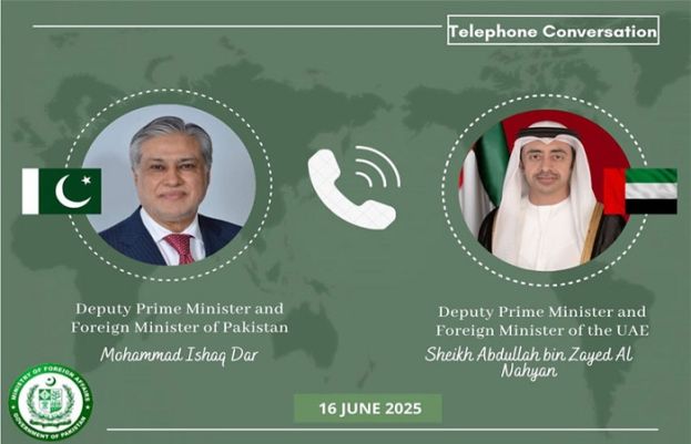 Deputy Prime Minister and Foreign Minister, Senator Mohammad Ishaq Dar received a call from the Deputy Prime Minister and Foreign Minister of United Arab Emirates, Sheikh Abdullah bin Zayed Al Nahyan. During the telephonic conversation, the two leaders discussed the evolving regional situation in the wake of Israel’s military strikes against Iran. They expressed deep concern over the escalating tensions and underscored the urgent need to support efforts for ensuring regional peace and stability.