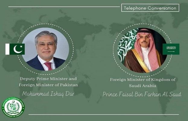 Deputy Prime Minister and Foreign Minister Senator Mohammad Ishaq Dar on Thursday received a telephone call from Saudi Foreign Minister Prince Faisal bin Farhan wherein they discussed regional situation and recent developments. Prince Faisal appreciated Pakistan’s commitment to peace and security in the region and emphasized the importance of collective efforts for stability. The deputy prime minister expressed gratitude for the Kingdom’s continued support and reaffirmed Pakistan’s resolve to work closely with Saudi Arabia to further strengthen cooperation on regional and internationalissues.