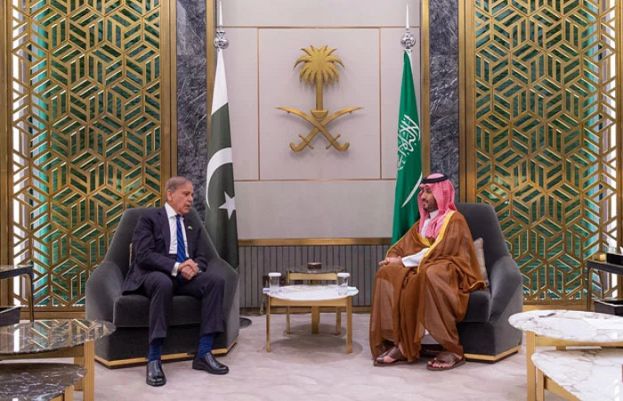 Prime Minister Shehbaz Sharif has reaffirmed Pakistan’s unwavering support for Saudi Arabia, as he told Crown Prince Mohammed bin Salman that Islamabad would stand firmly with the Kingdom during challenging times and continue working with it for peace in the region. Pakistan has intensified diplomacy following the ongoing Middle East escalation — triggered by US and Israeli attacks on Iran, martyring its supreme leader Ayatollah Ali Khamenei. PM Shehbaz and Deputy Prime Minister and Foreign Minister Ishaq Dar have since been in constant contact with their counterparts in the region as well as in the Gulf nations, playing a role in easing the regional tensions. The latest engagement came on PM Shehbaz’s brief trip to Jeddah, Saudi Arabia, where he held a restricted meeting with Crown Prince MBS. The two leaders discussed recent regional developments and the need for close cooperation to promote stability across the Middle East. At the start of the meeting, the minister conveyed his respectful regards to the Custodian of the Two Holy Mosques, King Salman bin Abdulaziz Al Saud, and expressed appreciation for Saudi Arabia’s longstanding support for Pakistan. Senior Pakistani officials, including DPM Ishaq Dar and Chief of Army Staff and Chief of Defence Forces Field Marshal Syed Asim Munir, were also present during the meeting. According to the official handout, the two sides held detailed discussions on the evolving regional situation and agreed to maintain close coordination in efforts aimed at ensuring peace and stability. “The Prime Minister expressed Pakistan’s full solidarity and support for the Kingdom of Saudi Arabia in these challenging times,” the PM’s media wing saidm The premier said Pakistan values its longstanding relationship with Saudi Arabia and will continue striving for the shared goal of regional harmony. “The prime minister assured His Royal Highness that Pakistan would always stand firmly with the Kingdom of Saudi Arabia and strive for their mutual desire for peace in the region,” it added. Following the high-level interaction in Jeddah, PM Shehbaz made his way back to Pakistan. It may be noted that, CDF Field Marshal Munir and Saudi Defence Minister Prince Khalid bin Salman also held a meeting last week, in which the two sides discussed Iranian attacks on the Kingdom within the framework of the joint strategic defence agreement between the two nations. Pakistan and Saudi Arabia signed the landmark Strategic Mutual Defence Agreement (SMDA) in September last year, which treats an attack on either nation as an act of aggression against both. In response to the US-Israeli aggression, Iran has targeted US bases and other targets in the Gulf nations, including in the United Arab Emirates (UAE) and Saudi Arabia, and has also closed the Strait of Hormuz, skyrocketing the price of oil — and warned that the world should be ready for $200 a barrel. Saudi Arabia intercepted two drones headed towards the Shaybah oil field on Thursday, as Iran targets the facility again in its campaign to disrupt global energy markets. Earlier, Saudi Arabia confirmed that it had prevented several drone attacks against the facility, which is crucial to the country’s oil production. Although Iranian President Masoud Pezeshkian has expressed regret over strikes in regional countries, Tehran has maintained that it will target those sites which are used to launch attacks on its soil.